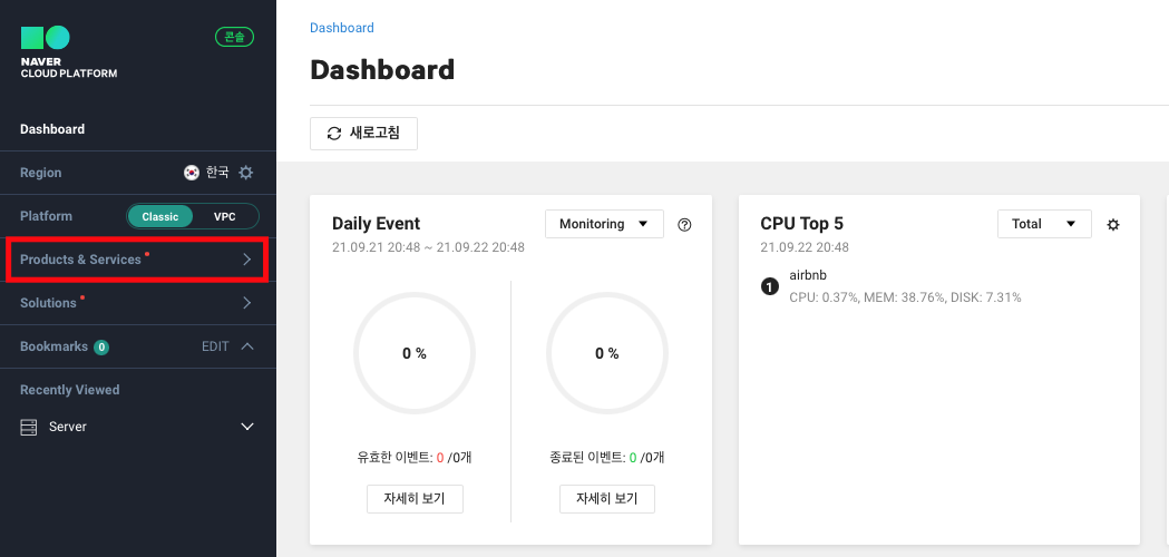 ncloud 콘솔 화면에서 Products & Services를 클릭 후 Public IP로 들어갑니다.