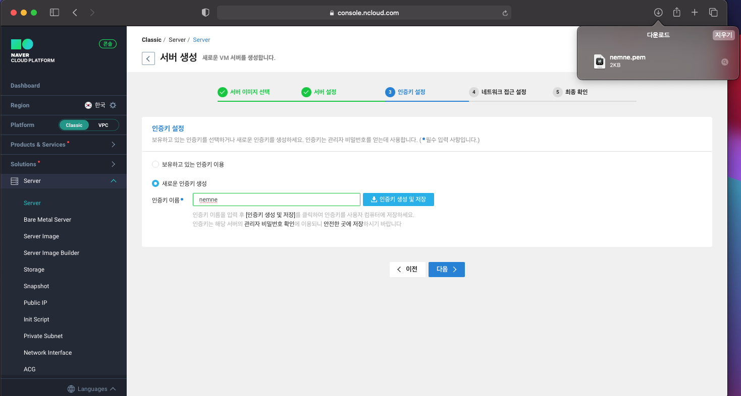 "인증키 생성 및 저장" 버튼을 누르면 name.pem 파일이 생성됩니다.