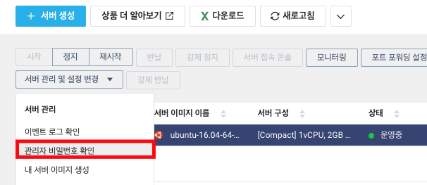이후에는 비밀번호를 입력해줘야 하는데 비밀번호는 서버 페이지에서 서버 관리 및 설정 변경 버튼을 누르고 관리자 비밀번호 확인을 누르면 알 수 있습니다.