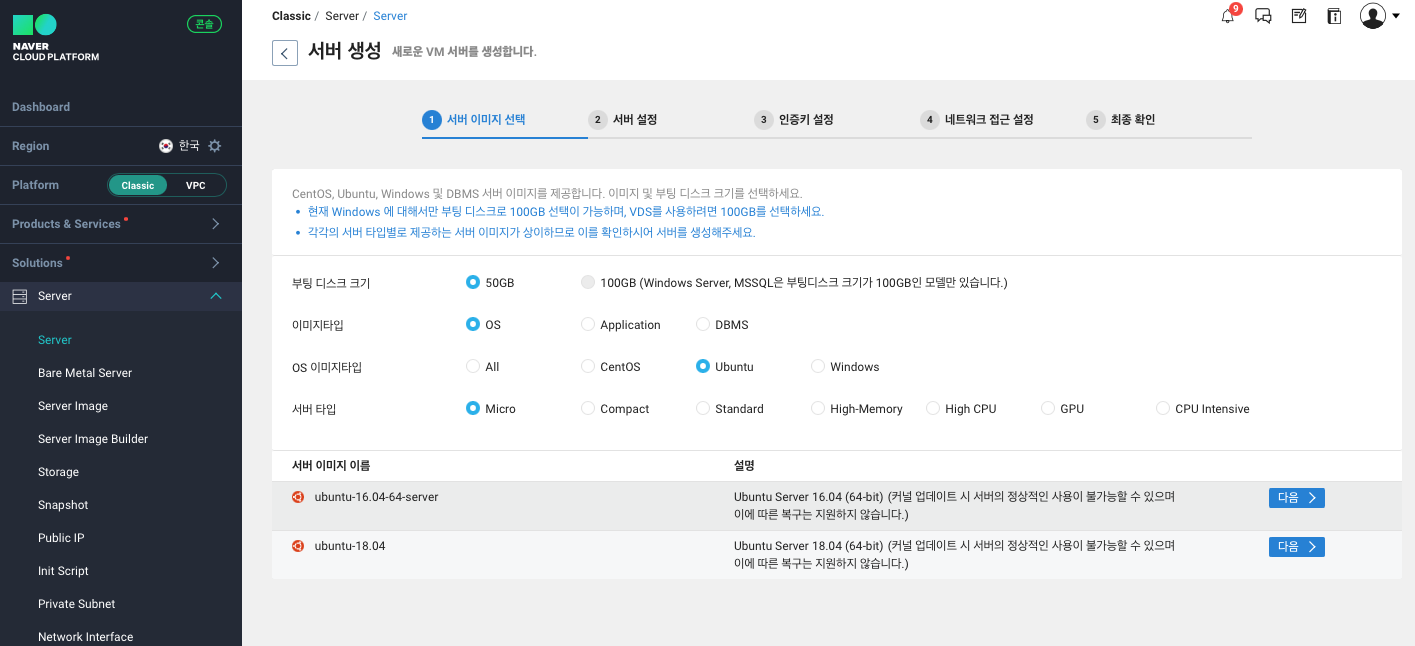 | 서버 타입 | - 목적에 맞는 서버 타입 선택 - Micro: 서비스 체험용(테스트 용도) 서버 - Compact: 개발 테스트 서버, 개인 홈페이지 운영, 소규모 웹사이트 운영 - Standard: 중/대규모 모바일/웹 서비스 운영, 게임/미디어/금융 서비스 운영 - High Memory: 고성능 데이터베이스 서버, 대규모 게임 서비스 - High CPU: 과학적 모델링, 게임 서버 - 부팅 디스크 타입에 따라 일부 서버 스펙 지원 불가 |