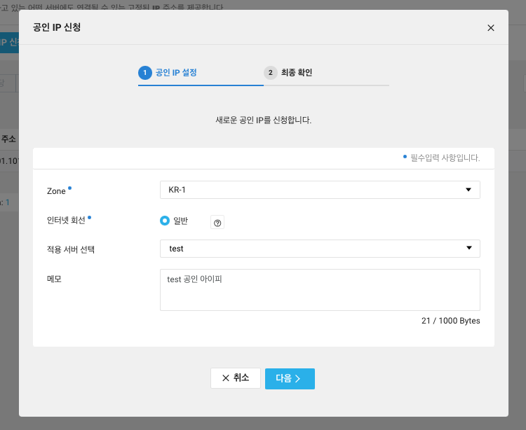 해당 화면에서 공인 IP 신청을 눌러줍니다.