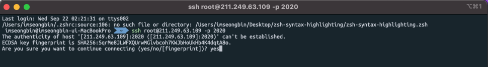 원격 접속은 터미널을 켠 뒤 ssh root@포트포워딩 설정에 있는 서버 접속용 공인 IP -p 2020를 입력해줍니다.