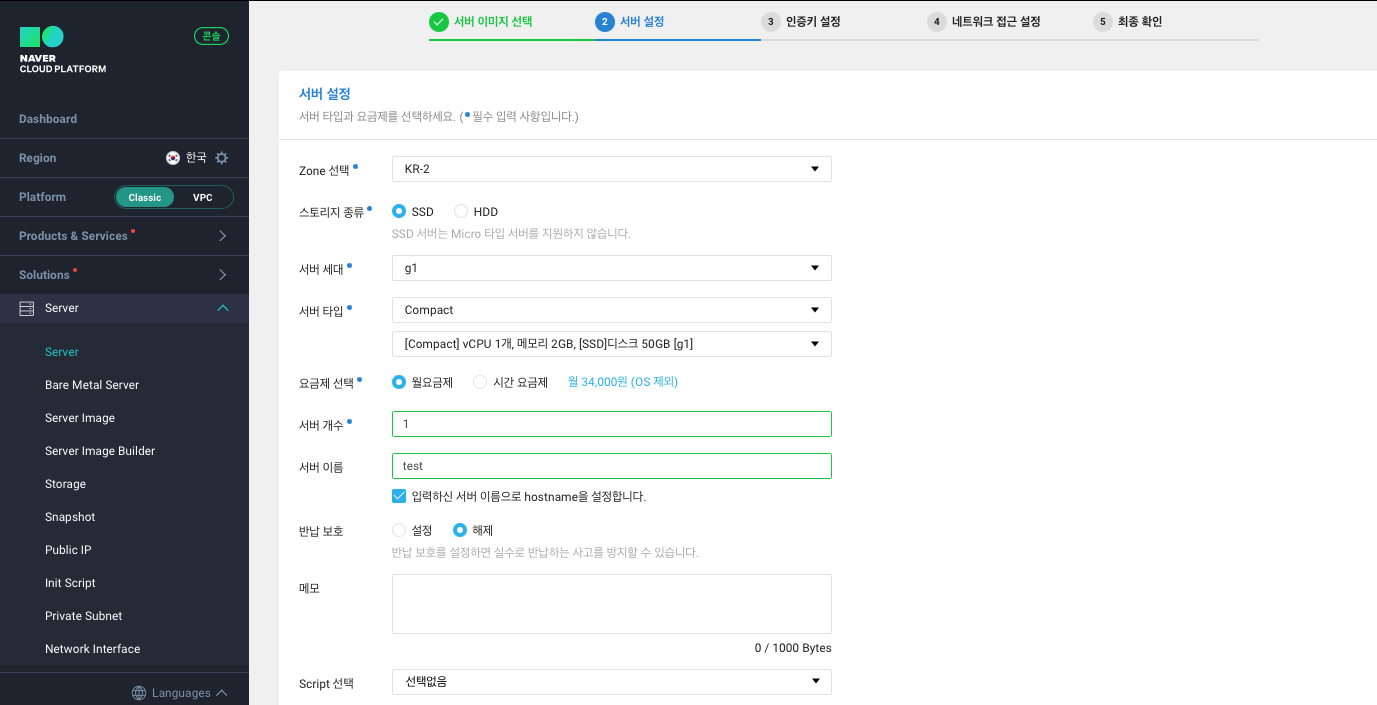 script 선택은 Init-Script으로 사용자가 미리 작성해 둔 스크립트를 서버 생성 시 자동으로 실행시킬 수 있는 기능으로, 서버의 초기 환경 구축 시 편리하게 활용할 수 있습니다. 만약에 따로 설정할 스크립트가 없다면 넘어가도 됩니다.