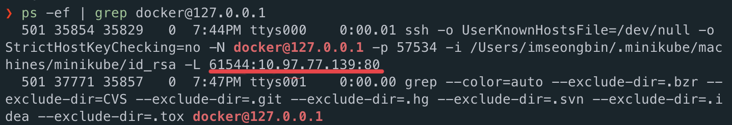 이제 현재 터미널을 종료하지 않고 새로운 터미널을 열어 ps -ef | grep docker@127.0.0.1를 실행시켜준다.