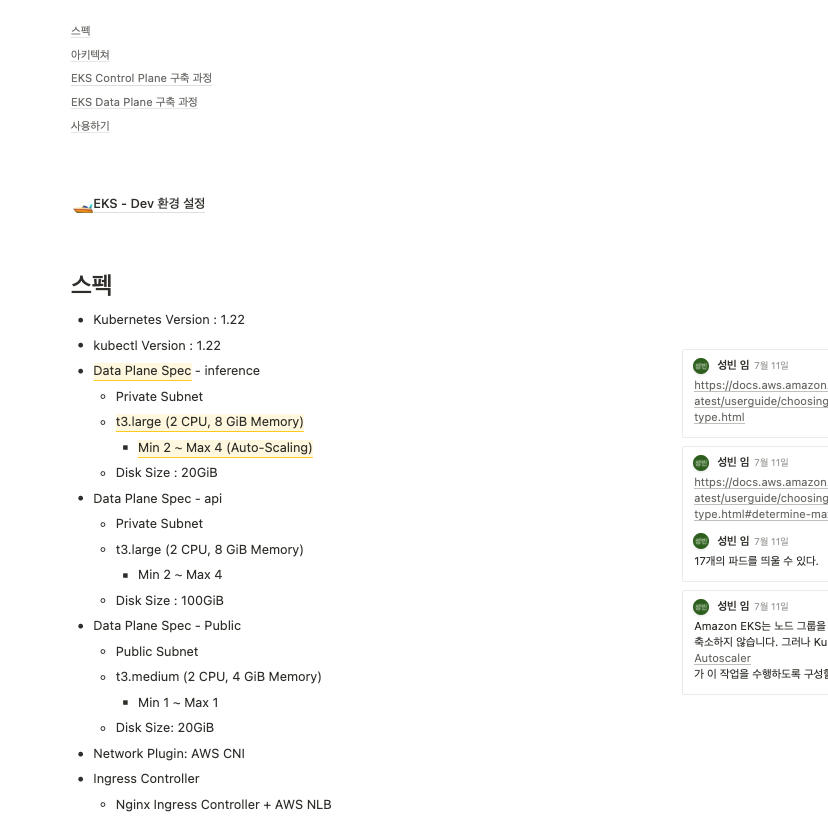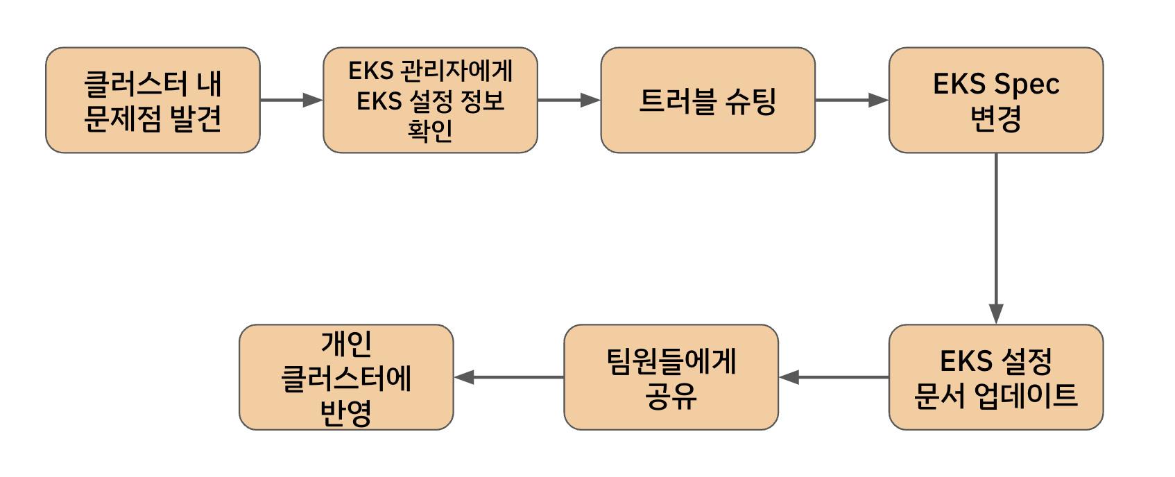 문서화를 했을지라도 개발 초기였기 때문에 EKS spec을 변경하는 상황이 자주 발생했습니다. 이로 인해 문서를 변경하고, 팀원들에게도 변경 사항을 공유하고, 팀원들의 클러스터 내에서도 이를 반영해야 하는 불필요한 커뮤니케이션 홉이 발생했습니다.