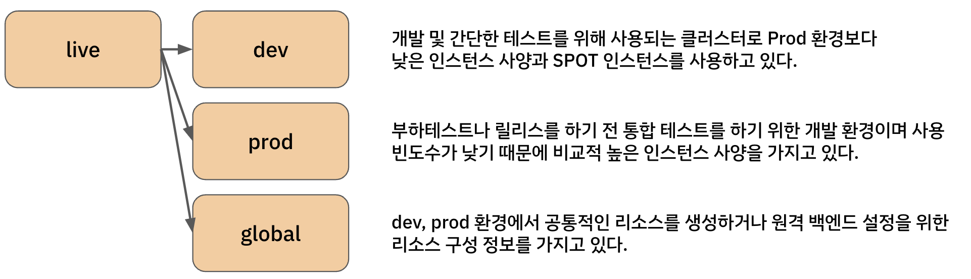 따라서 Dev 환경과 Prod 환경을 나눠서 개발을 진행했으며 이 중에서도 dev, prod 모두 공통적으로 필요한 리소스들은 global로 옮겼습니다.